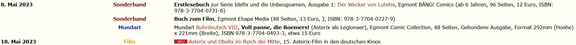 Erik hat geschrieben: 5. März 2023 18:01 ...und ein Erstlesebuch zum Film mit der ISBN 978-3-7704-0727-9. Dieses letzgenannte wird bei Amazon.de als "Asterix - Im Reich der Mitte - das offizielle Buch zum Film" angekündigt. Dass es ein "Erstlesebuch" ist, steht dort nicht im Titel, kann aber daraus geschlossen werden, dass in den Artikeldaten "Lesealter: ‎ Ab 6 Jahren" angegeben ist.