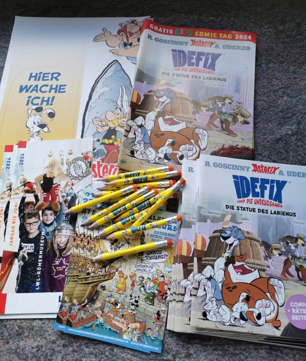 u.a. Idefix die statue de Labienus (Werbung und Comictag sind verschieden), einige Broschüren und Idefix-Bleistifte
