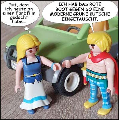 Sehr schön. Überhaupt könnte man mal alternative Asterix-Welten entstehen lassen. So nach dem Motto, wie wäre die Geschichte gelaufen, wenn eine Initialszene nicht so stattgefunden hätte, wie sie im Original gezeichnet wurde. Könnte man dann auch mit Playmobilfiguren nachstellen.