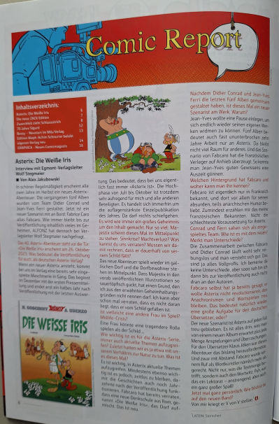 der bestehende Bibliothekseintrag "Alfonz" sollte um die aktuelle Ausgabe 4/2023 - Oktober-Dezember 2023 - ergänzt werden. Darin befindet sich ein ganzseitiges Interview mit dem Egmont-Verlagsleiter Wolf-Stegmeier, geführt von Alex Jakubowski, zu dem Band "Asterix - Die weiße Iris". Das Interview stammt allerdings von vor dem Erscheinen des Bandes, so dass Wolf Stegmeier darin auf den konkreten Inhalt noch kaum eingehen darf. Er bewertet den neuen Band - angesichts seiner Stellung als Verlagsleiter wenig überraschend - mit "V von V stellae".