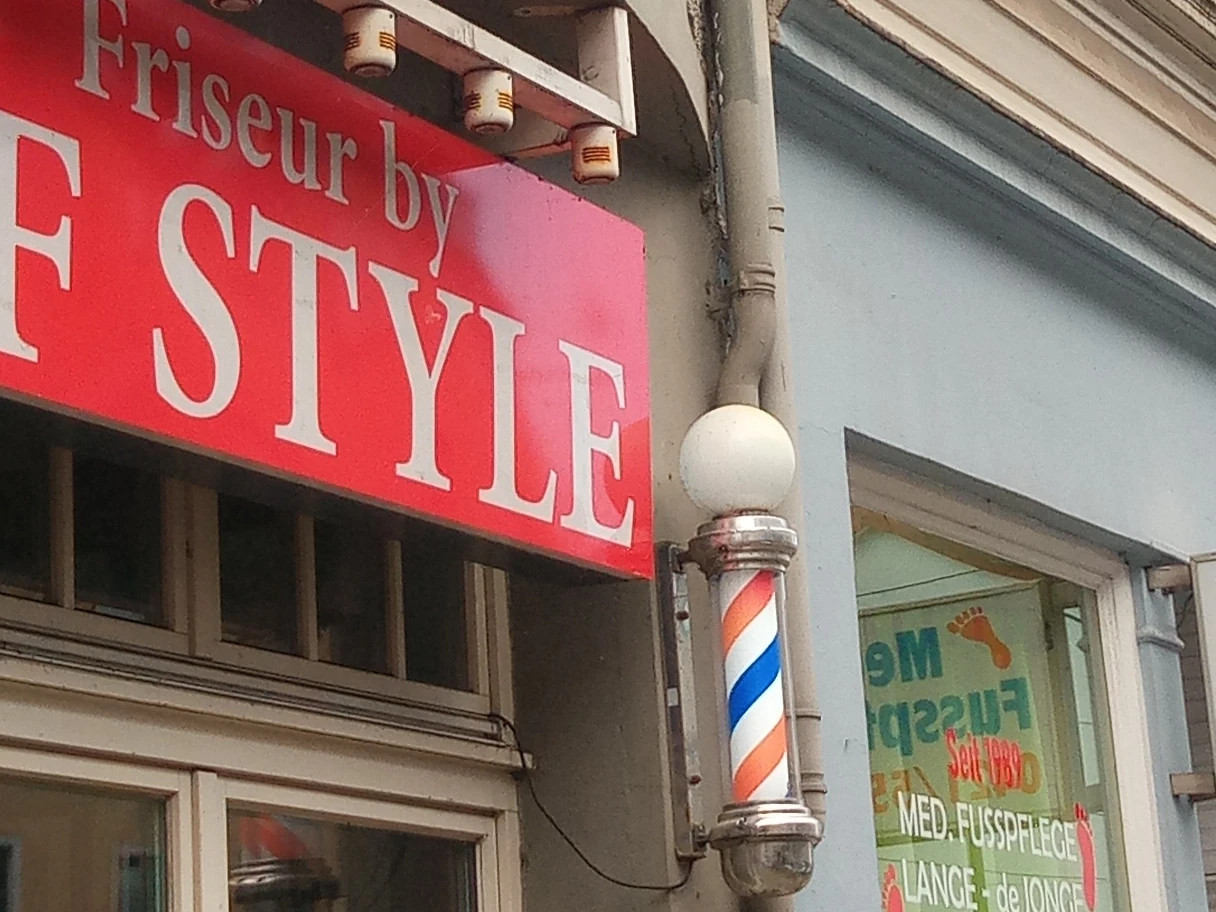 Die Barbierstange hat hierzulande erst in den letzten Jahrzehnten Verbreitung gefunden, ich kenne noch die Tellerschilder, die zur Straße hin über der Eingangstür hingen. Die Stangen sind bei uns meist blau-weiß-rot bemalt, in meinen Asterix-Alben finde ich dagegen weiß-blau und weiß-rot. Wikipedia meint dazu: "Bisher waren in Europa Friseurstangen vorrangig rot und weiß, in Amerika hingegen sind sie eher rot, weiß und blau". Diese Stange ist jedenfalls eine Werbung für ein Friseurgeschäft, ganz ohne Text und Bild, nur mit Form und Farbe.