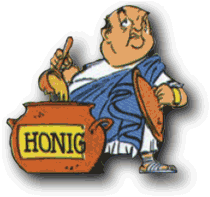 Schon im Band "Asterix bei den Schweizern" spielt Honig als Zusatz von in Auerochsenfett gebratenen Schweinskaldaunen bei den Orgien von Aggripus Virus, dem Statthalter Roms in Condate, eine nicht unwesentliche Rolle und in "Die Lorbeeren des Cäsar" gehört Honig zu den Zutaten eines Eintopfs, den Asterix und Obelix als Sklaven der Familie Überflus während des Mahls präsentieren.