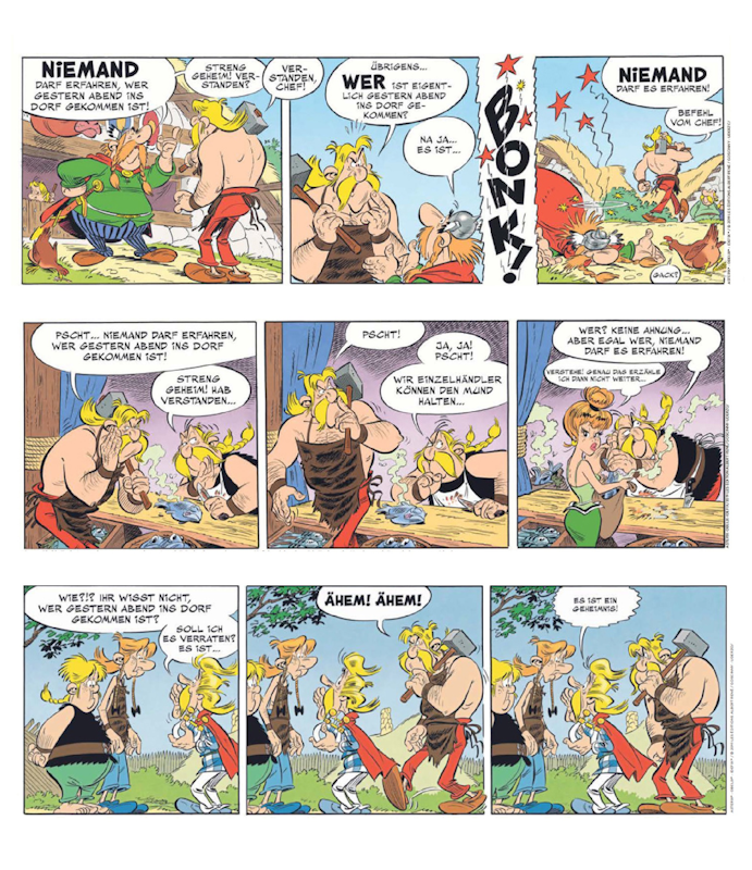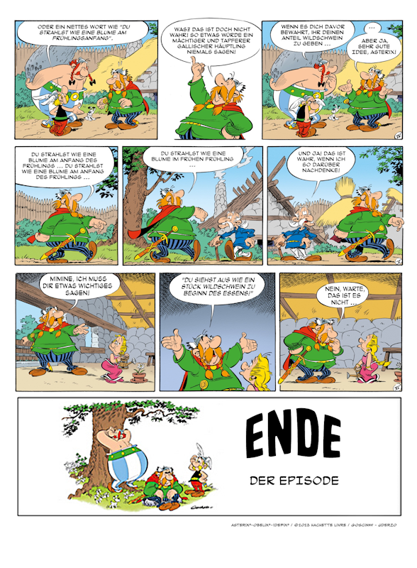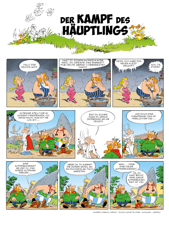In einer weiteren zweiteiligen Ankündigung mit dem an das Abenteuer "Der Kampf der Häuptlinge" angelehnten Titel "Der Kampf des Häuptlings" wird eben dieses im Gallierdorf überlieferte und gepflegte Rollenbild anhand des unsensiblen und gerne als "toxisches" Verhalten am Beispiel von Majestix hinterfragt. Dass sich schließlich nach 48 Seiten praktisch nichts verändert, verwundert nicht (Abbildung Seite 1 und Abbildung Seite 2).