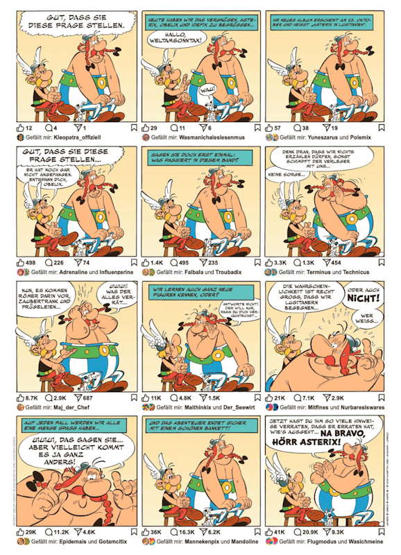 Exklusiv in der Asterix-Sonderausgabe der "WELT am Sonntag" erschien zudem ein einseitiges Interview von Asterix und Obelix im Social-Media-Stil mit einem nicht genannten Influencer in deutscher Sprache. Dort plaudert Asterix mit dem Gegenüber, während Obelix große Sorge hat, dass sein Freund zu viele Informationen über das neue Abenteuer preisgibt.
