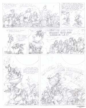 In der Personalunion Zeichner und Autor fertigt Albert Uderzo bereits während des Schreibens schnelle Bleistiftskizzen an, die sich nur ihm allein erschließen (Abbildung links) und bestimmt dabei Größe und Anzahl der Bildkästchen.