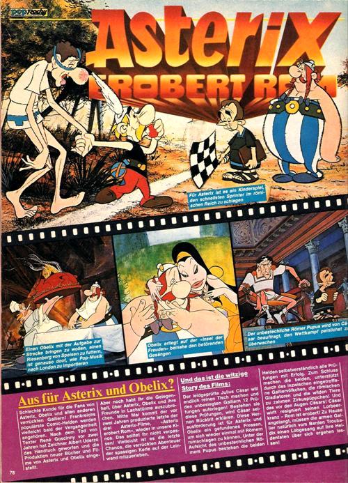 - Pop/Rocky Nr. 11/1982: ganzseitiger Filmbericht und vierseitiges Filmplakat-Poster zu "Asterix erobert Rom"