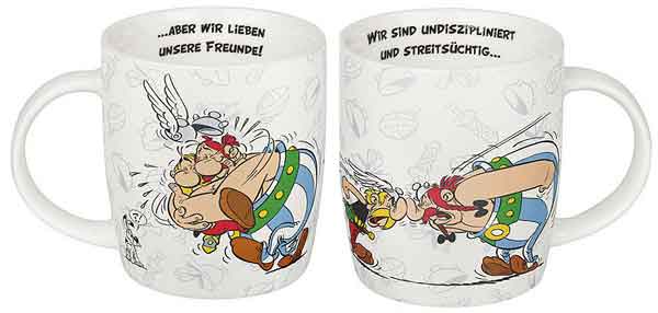 Anlässlich des Kinofilms "Asterix im Land der Götter" erschien im Februar und April 2015 bei der "Könitz Porzellan GmbH" eine Serie von 13 Tassen mit unterschiedlichen Motiven bzw. unterschiedlichen Beschriftungen. Einige Tassen haben auch auf der Innenseite eine Motivabbildung. Die Becher kosteten zwischen 7,95 und 16,90 Euro, je nach Ausführung. Später sind ab März 2016 noch weitere Tassen erschienen, die in der Übersicht entsprechend markiert sind. Folgende Motive sind erschienen: