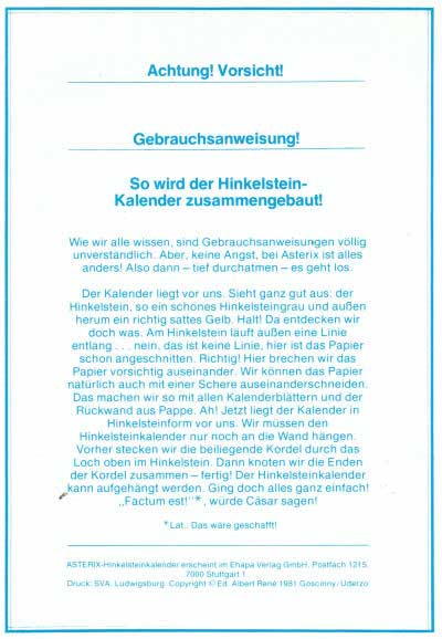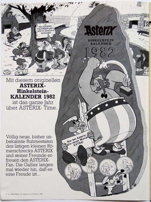 Für das Jahr 1982 veröffentlichte der Ehapa-Verlag für DM 14,80 einen 35 cm großen Kalender im Hinkelsteindesign, der Zeichnungen enthielt, die aus keinem Asterix-Comic stammen. Der Kalender wird auf der Innenseite des Titels des ersten Knobelix-Rätselheftes beworben. Seine Besonderheit ist, dass er ein zusätzliches Monatsblatt für den Scherzmonat Extember enthält. Das ist der Monat für alle, die mehr Urlaub brauchen, gekennzeichnet dadurch, dass jeder Tag des Monats frei ist. Zudem lag dem Kalender eine Gebrauchsanweisung bei, die sehr unterhaltsam geschrieben ist.