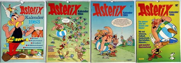 Für die Jahre 1983 bis 1986 veröffentlichte der Ehapa-Verlag Spiralkalender mit den Maßen ca. 28 cm x 40 cm (Motivübersicht). Zur Illustration eines Monatsblattes wurden nicht nur Abbildungen aus den Asterix-Comics verwendet, sondern unter anderem auch neue Zeichnungen, die jedoch nicht von Albert Uderzo stammen. So findet sich beispielsweise im Kalender von 1983 auf dem April-Blatt die "Laetitias Allgemein Zeitung - LAZ" mit fiktiven Nachrichten aus Gallien und auf dem Juni-Blatt eine Art Asterix-Index mit Fundstellen zu Namen in den Asterix-Bänden.