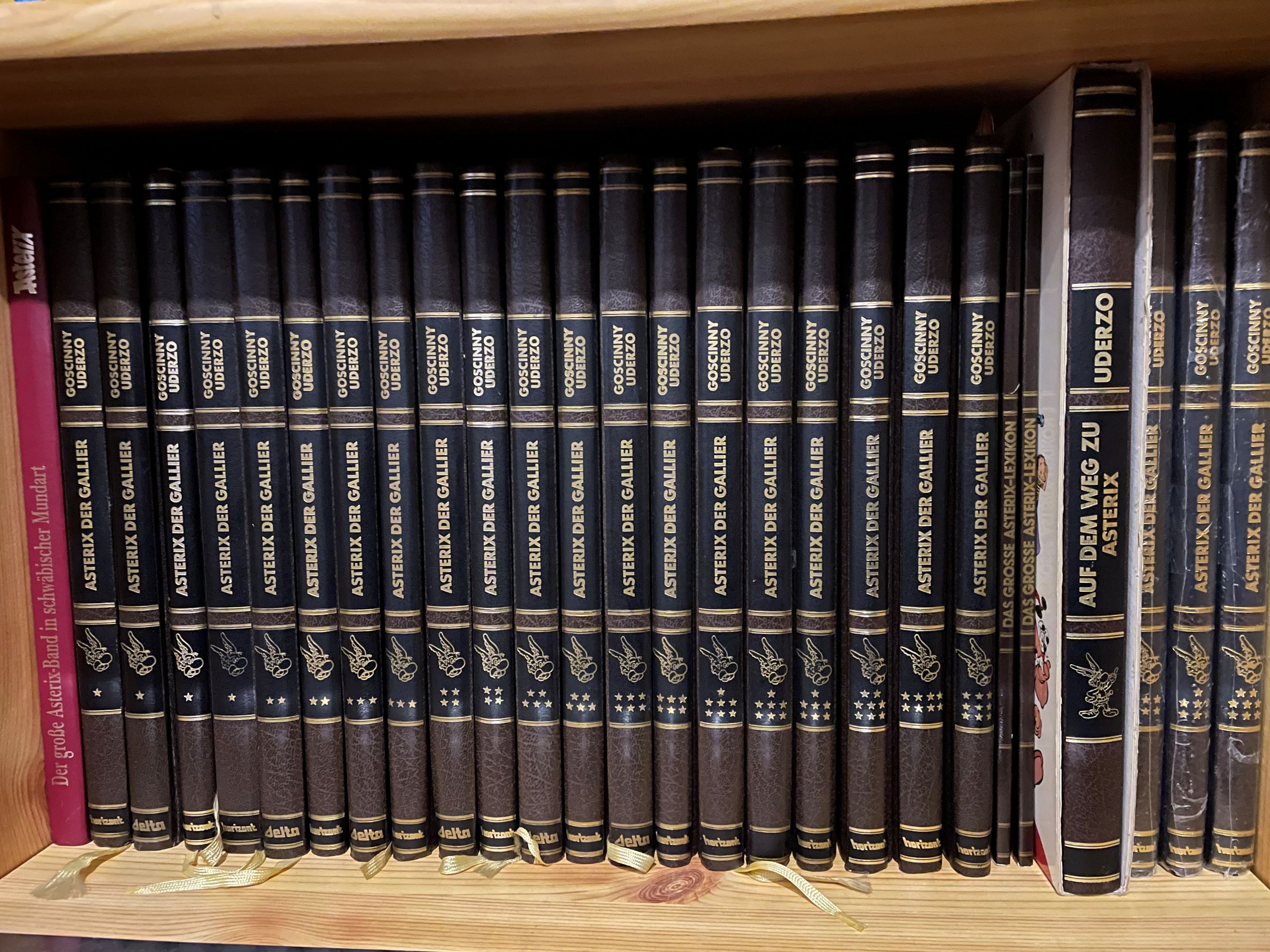 die ersten sechs Bände gibt es sowohl von Delta (von 1984) als auch von horizont (1986). Bei Delta steht Delta auf dem Buchrücken und innen steht Verlag: Delta, Exclusiv-Vertrieb: Horizont, (c) DELTA 1984 und auf der rechten Seite Delta und Horizont Verlag. Bei horizont entsprechend horizont auf dem Buchrücken und innen steht Verlag: Horizont, Exclusiv-Vertrieb: Horizont, (c) Horizont 1986 und auf der rechten Seite Horizont Verlag. Als Sonderfall gibt es dann Band 1 mit einem goldfarbenen Stempel Numerierte Asterix-Exclusiv-Auflage '86, Erstband- Buchstabe 6 Ziffern Sternchen. Auf dem Buchrücken steht horizont und innen steht Verlag: Horizont, Exclusiv-Vertrieb: Horizont, (c) DELTA 1984 und auf der rechten Seite Horizont Verlag.